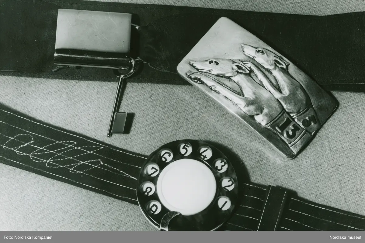 Skärp med skärpspämnne som nummerskiva på äldre telefoner. Skärpspänne med hundar. Nyckelhållare.