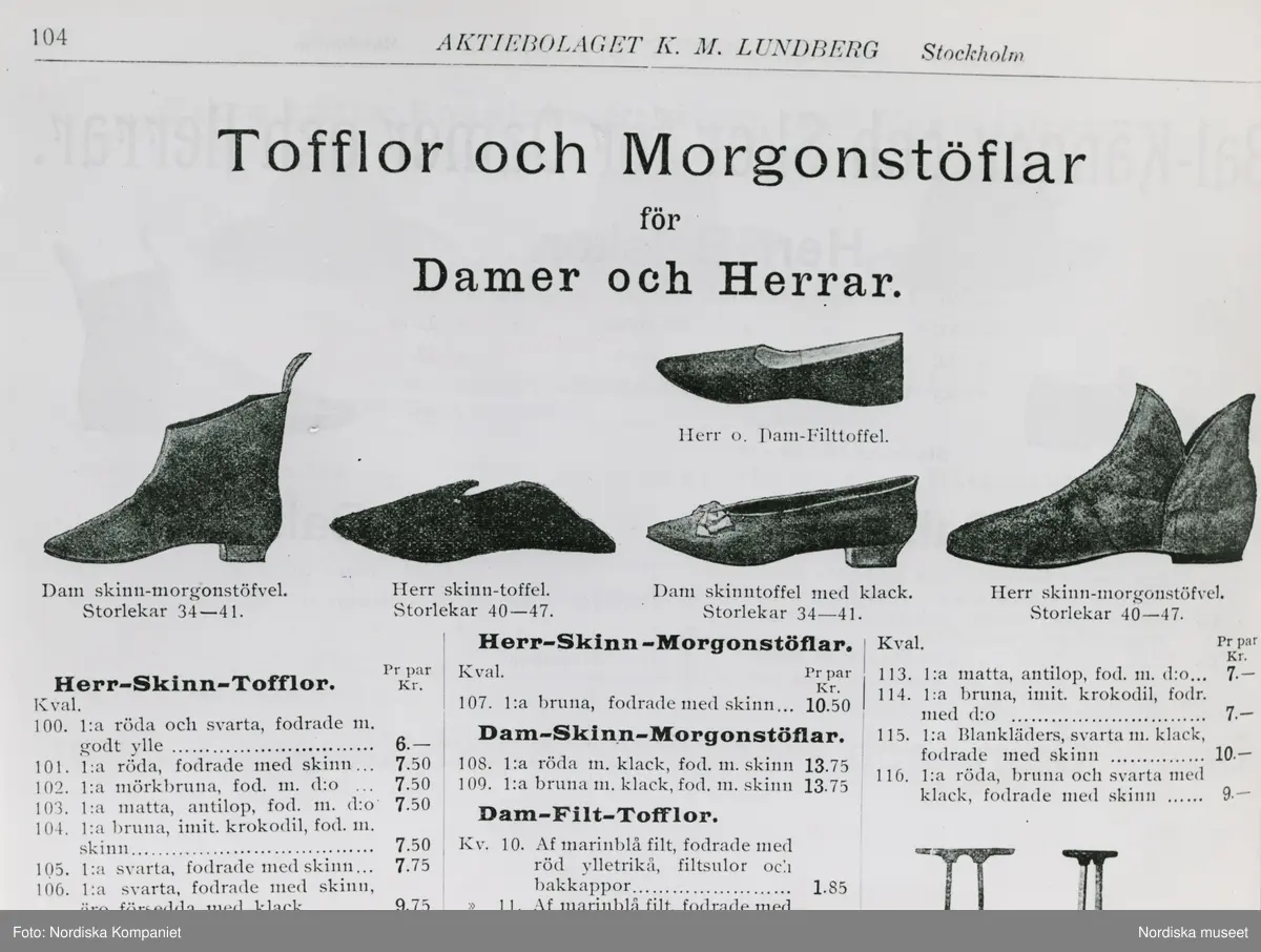 Fotografi av sida ur varukatalog, Herr-Skinn-Tofflor, Herr-Skinn-Morgonstöflar, Dam-Skinn-Morgonstöflar, Dam-Filt-Tfflor.