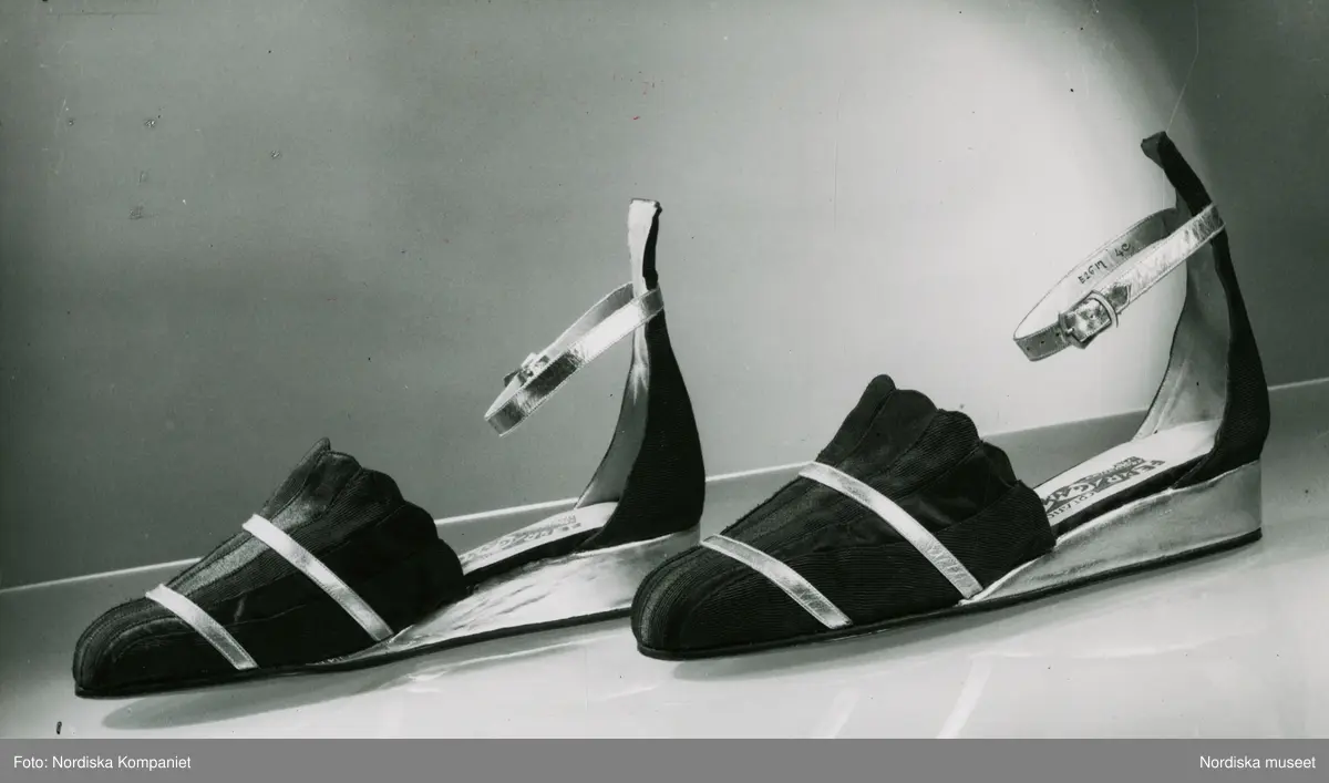 Sko med låg kilklack och vristrem. Mocka och silverfärgat skinn.