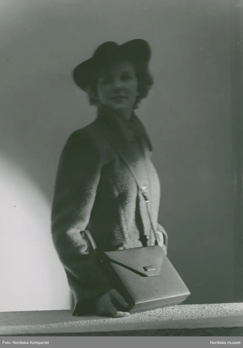 Modell i kappa, hatt och handväska.