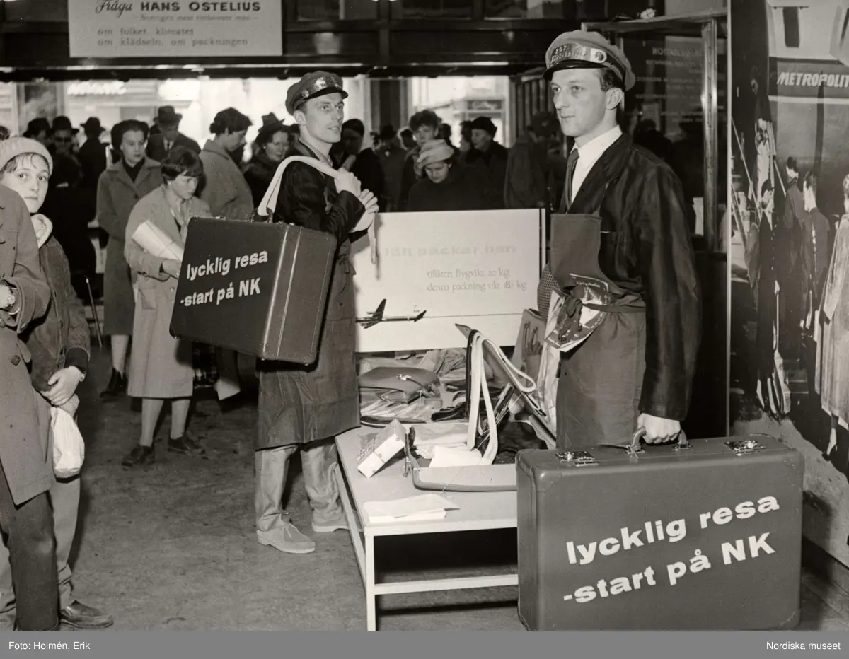 Stadsbud med reseeffekter med texten "Lycklig resa - start på NK". Nordiska Kompaniet.