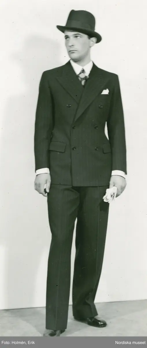 Helporträtt av en man i kritstrecksrandig kostym med dubbelknäppning, hatt och vita handskar i handen. Ulriksdal.