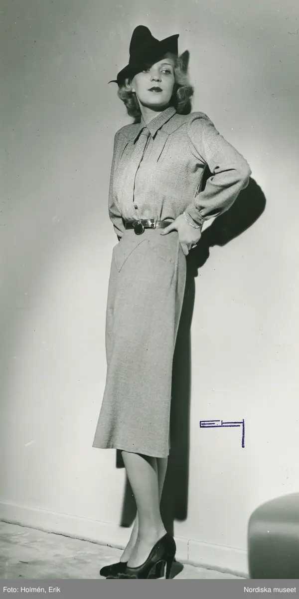 Helporträtt av kvinna i blus och kjol av Robert Piguet och hatt.