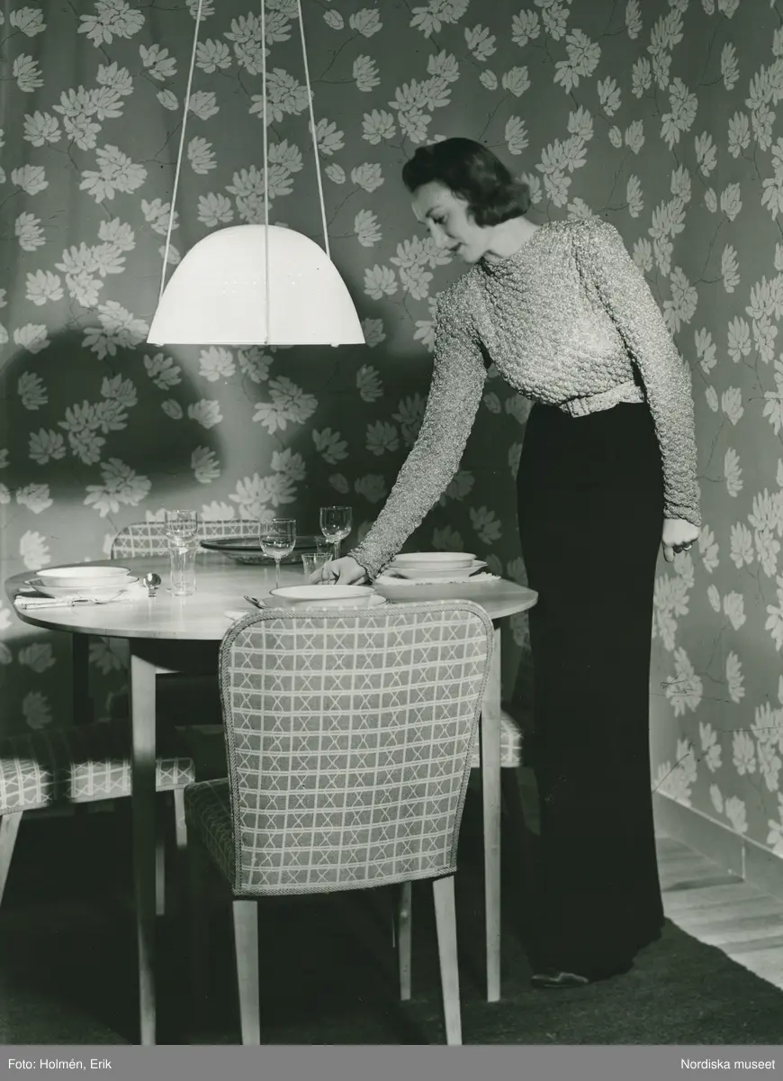 Helporträtt av kvinna i hellång klänning med skärp, står vid dukat bord.