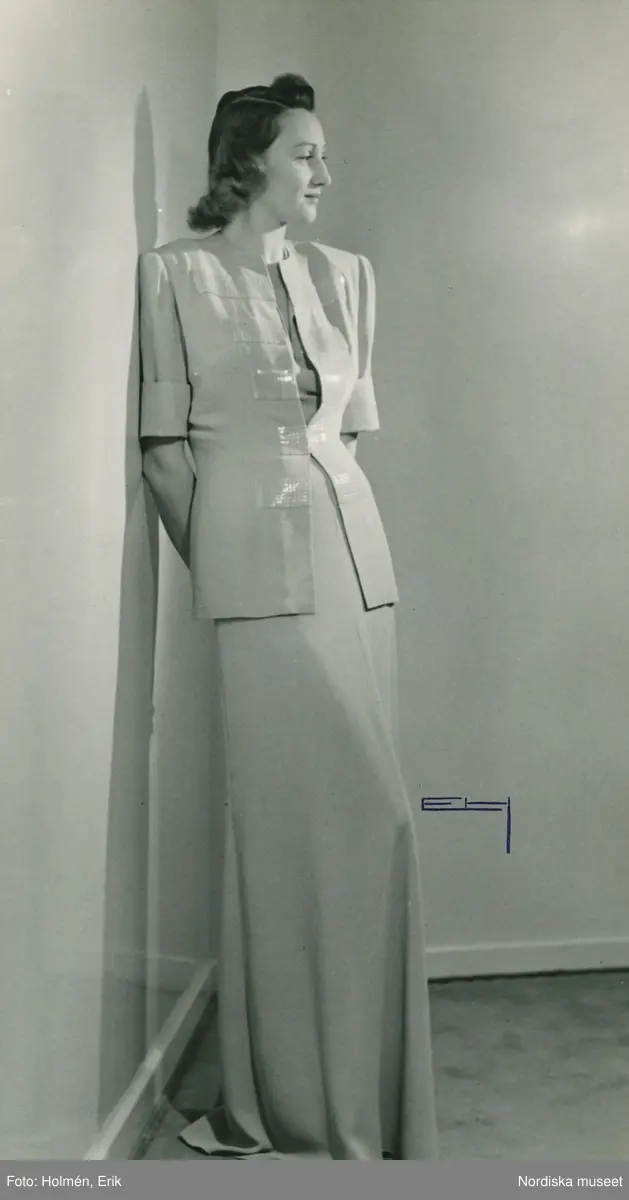 Helporträtt av kvinna i långklänning och jacka med grå paljetter av Gaby Jouval.