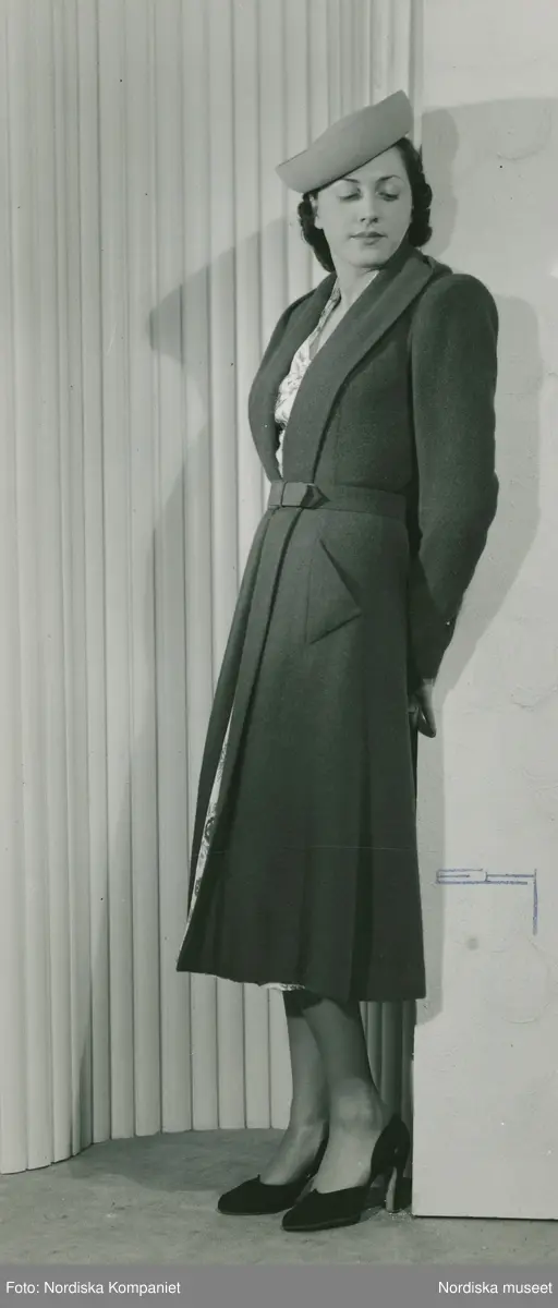 Modell i kappa, pumps och hatt, av Robert Piguet.