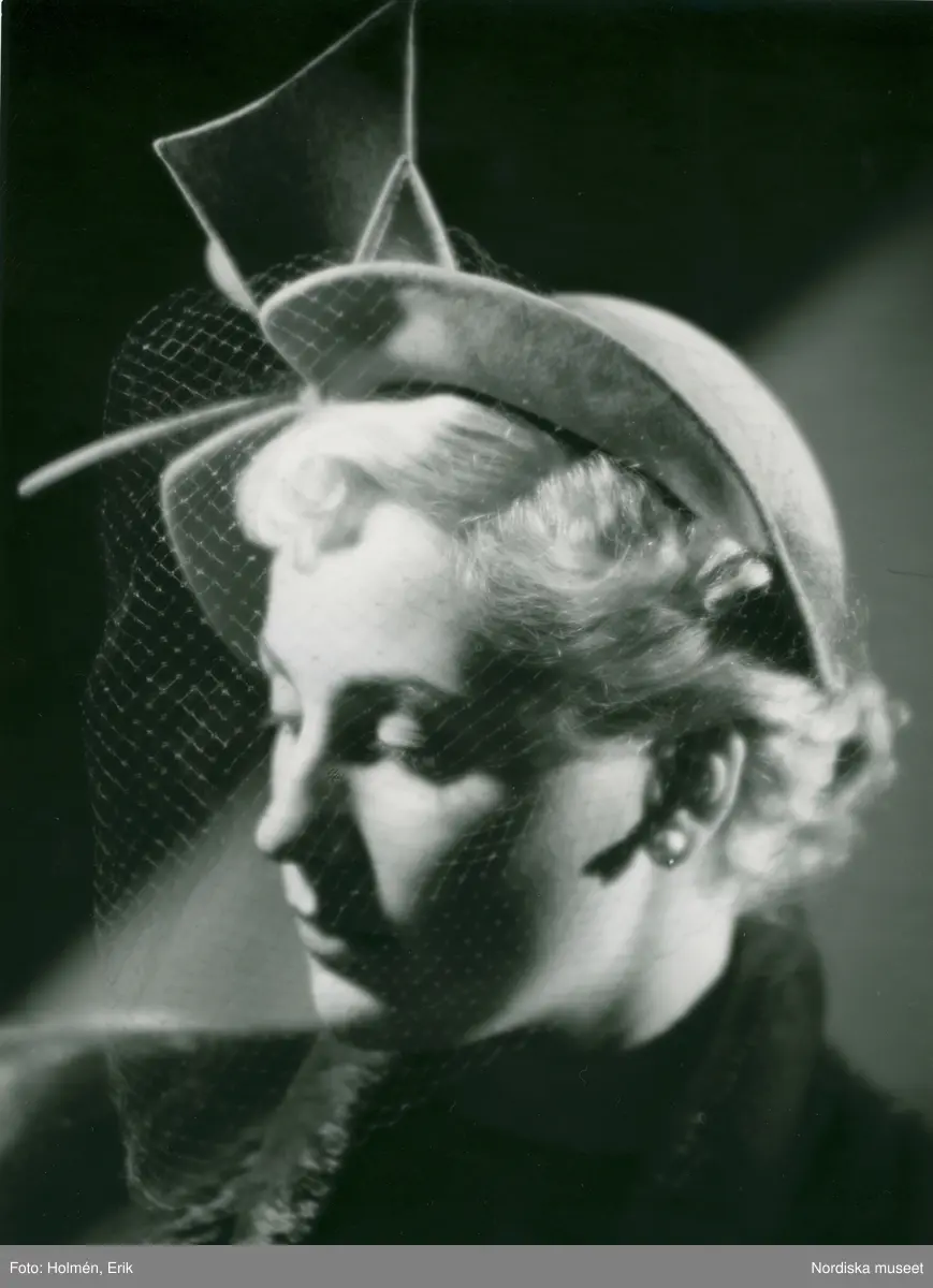 Porträtt av kvinna i beige filthatt med rosett av filt infodrad med brun jersey. Modell efter Rose Descat.