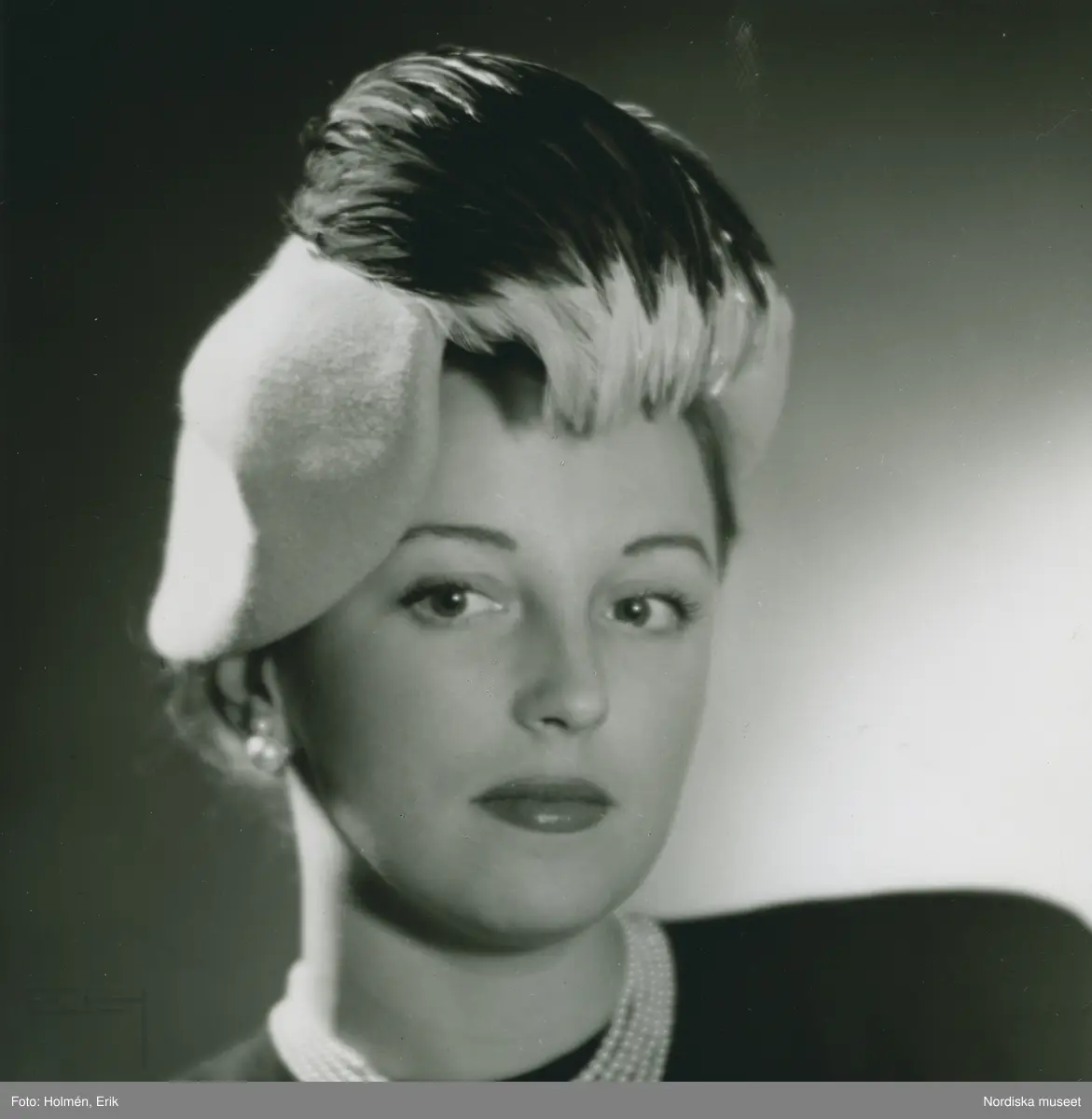 Porträtt av kvinna i gul filthatt med fantasie. Modell från Madame Paulette.