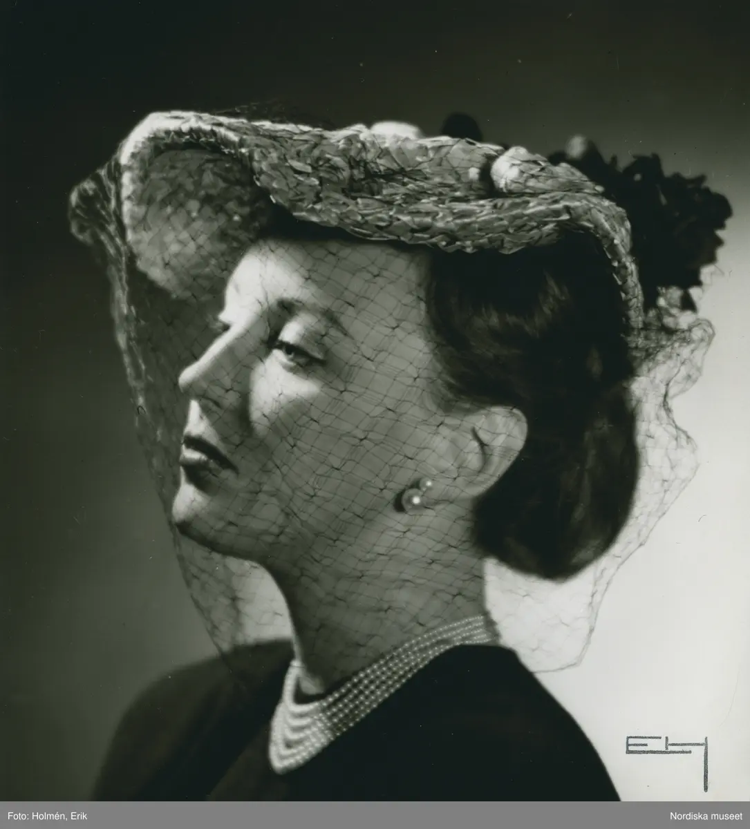 Porträtt av kvinna i grov naturfärgad stråhatt monterad med svarta rosor och flor. Modell av Maud Roser.