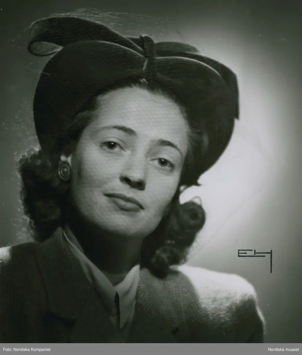 Modell i hatt med låg kulle, hjärtformat brätte, dekor i samma material som hatten. Flor.