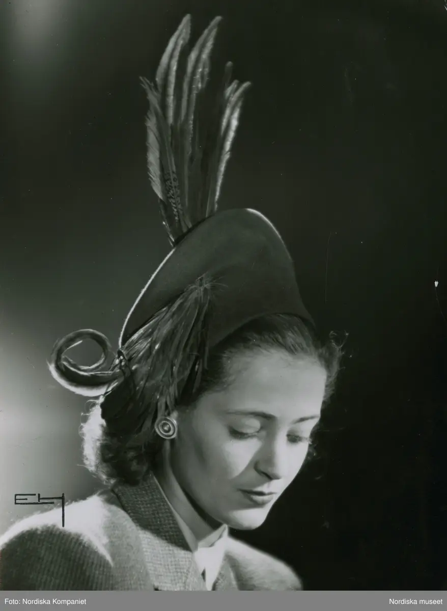 Modell i hatt med hög kulle, utan brätte. Höga fjädrar trädda genom kullen.