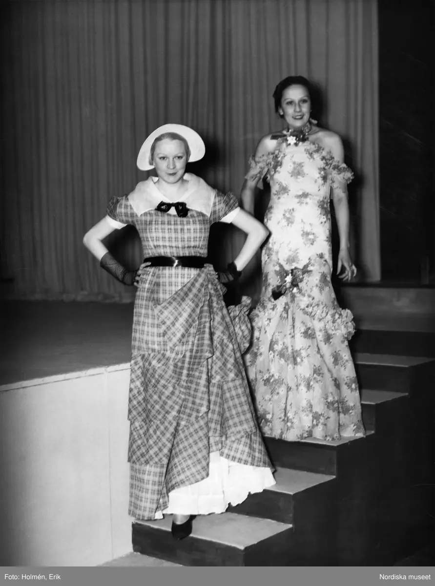 "Wienermodeschau" på Nordiska Kompaniet.Två modeller går nedför en trappa i hellånga klänningar. Modellen längst fram bär rutig klänning med vit underkjol, vit krage och hatt. Modellen längst bak bär blommig klänning med halterneck och blomsterdekorationer.