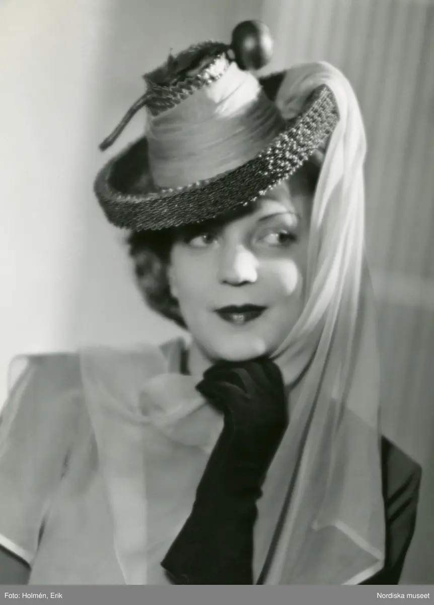 Porträtt av kvinna i hatt med ljus slöja och dekoration på kullen, samt svarta handskar och ljus klädsel.
