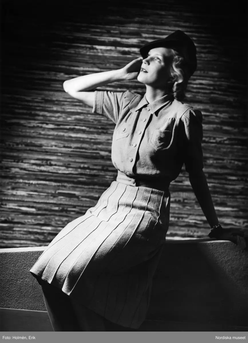 Modell i ljus klänning med veckad kjol, svart hatt och pumps. Sitter på en mur.
