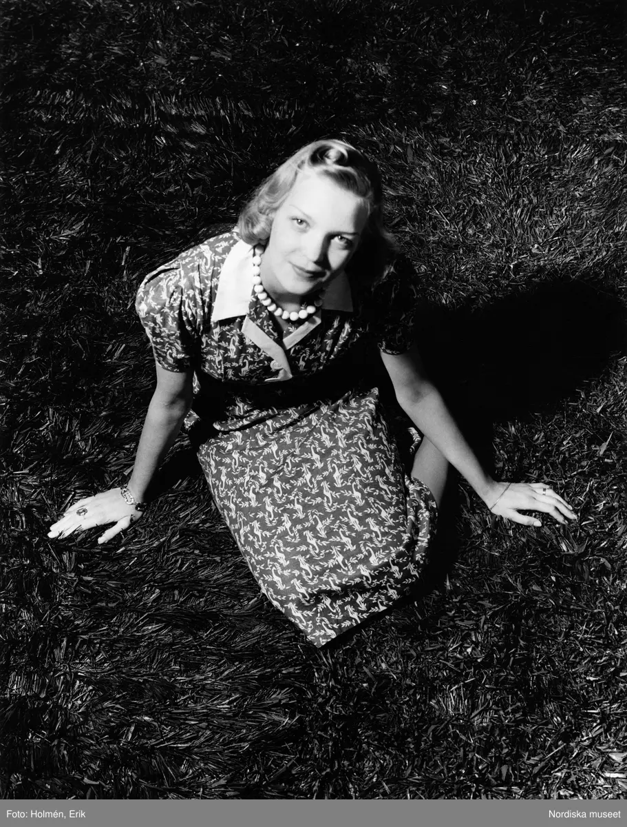 Modell i mönstrad klänning och smycken sitter på gräs.