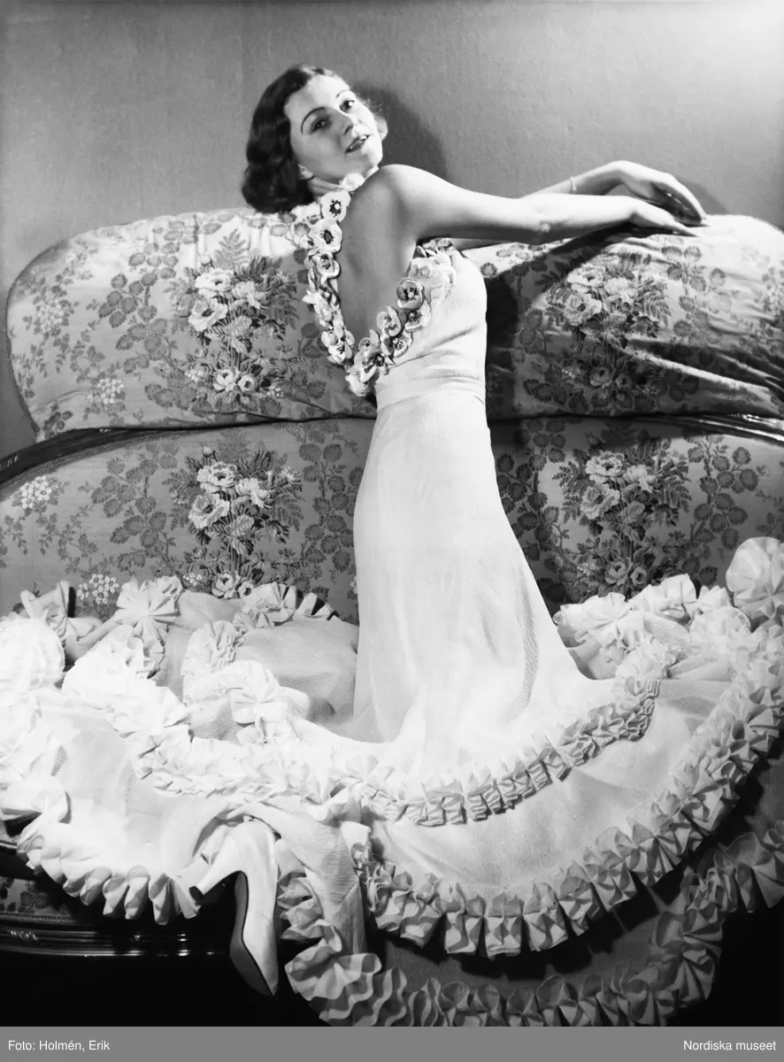 Lilian Harvey - utställning på Nordiska Kompaniet. Modell klädd i vit balklänning med volanger och blomdekorationer. Står vid en blommig soffa.