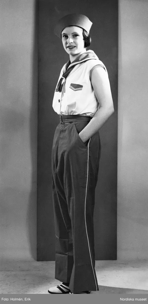"Sailor". Modell i utsvängda byxor, vitt linne och matroshatt. Finns i olika färger: marin med vit, röd och helt ljusblå.