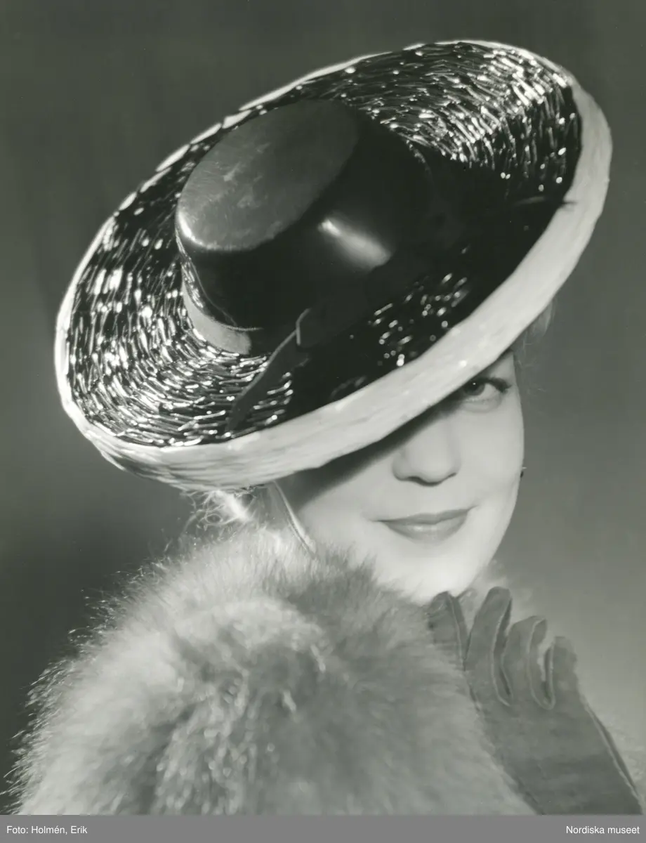 Porträtt av kvinna med hatt i lack. Päls och handskar.