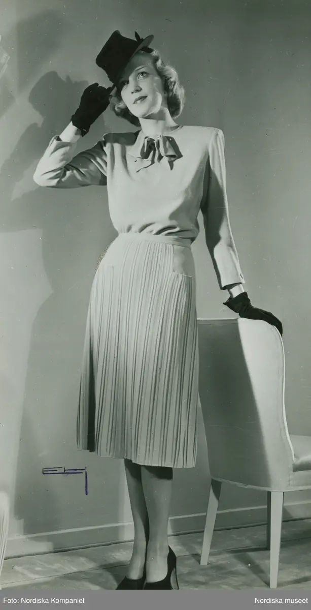 Modell i veckad kjol och tröja med rosett i halsen, handskar, pumps och hatt av Edward Molyneux.