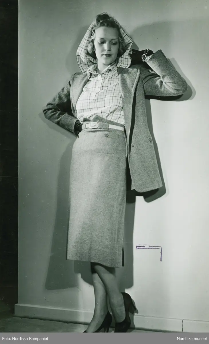 Modell i dräkt och rutig blus med kapuschong, handskar och pumps.