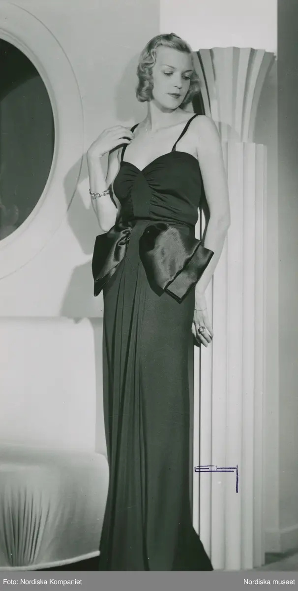 Modell i aftonklänning dekorerad med sidenrosett.