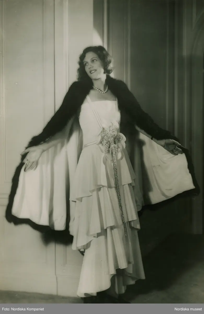 Modell i vit klänning med strassbroderi, samt 3/4 lång cape i svart pannesammet och halsband. Från Lanvin.