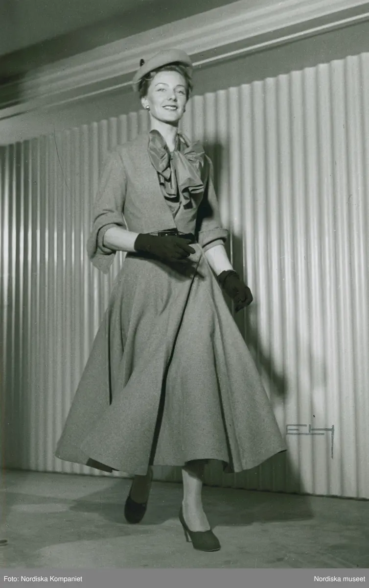 Modell i klockad kjol, jacka och knytblus, hatt, handskar och pumps, från Dior.