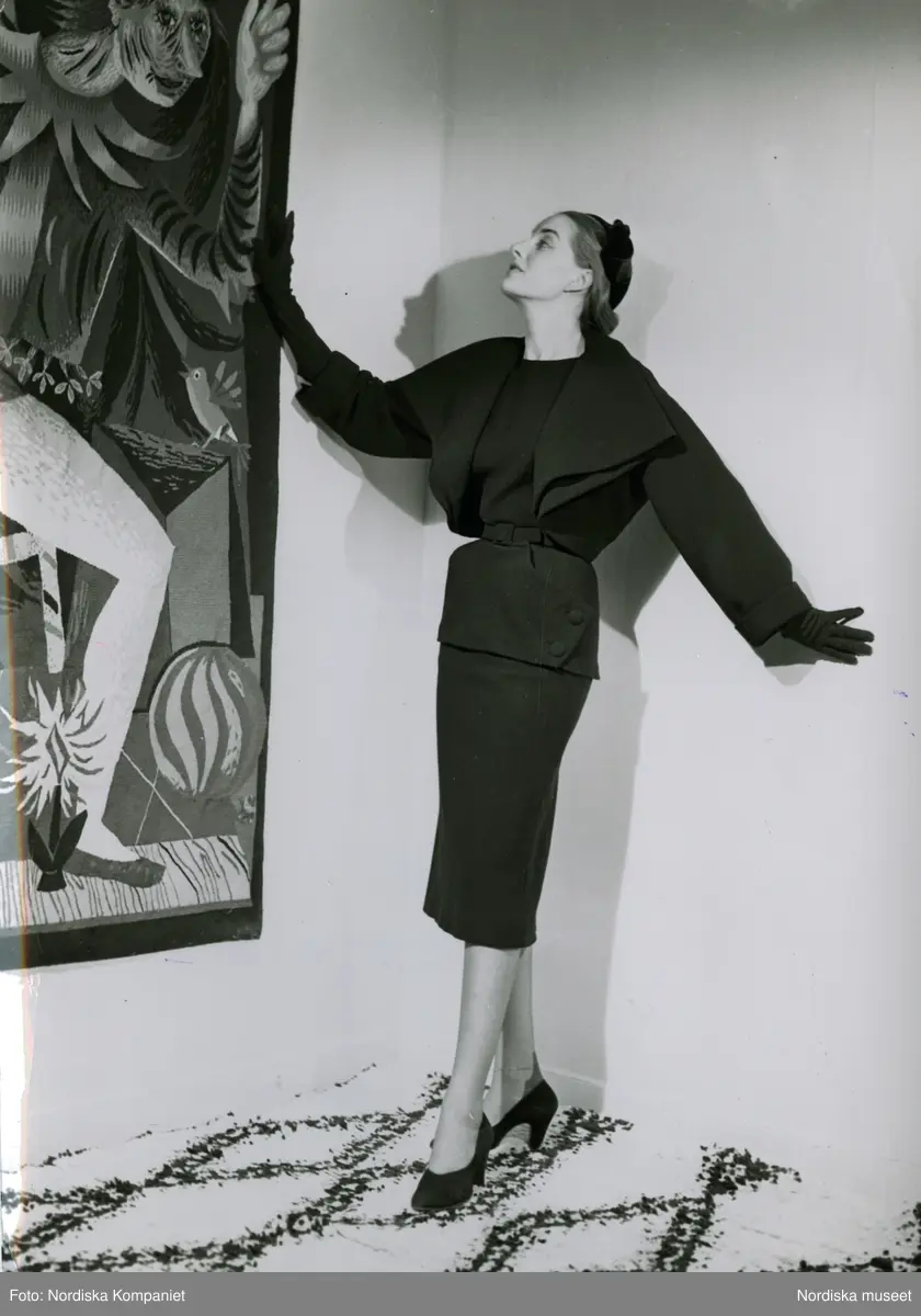 Modell i dräkt, jacka med dubbelvikta slag, hatt, handskar och pumps. Textilkonstverk på väggen och matta på golvet.
