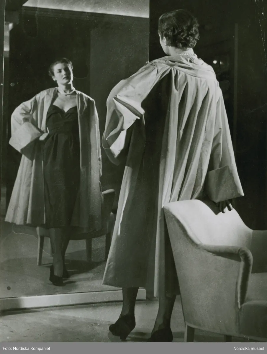 Modell i mörk klänning och karamell-skär aftonkappa i faille, speglar sig framför en fåtölj. Från Edward Molyneux för Idun.