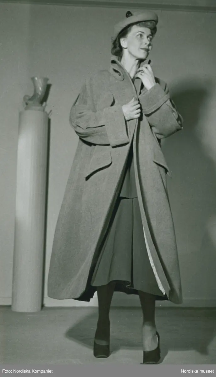 Modell i kappa, hatt och pumps från Madeleine de Rauch. Pelare i bakgrunden.