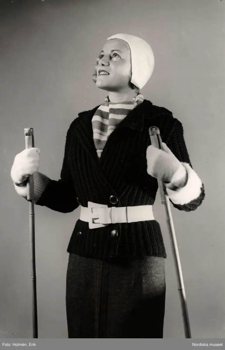 "Stickat", kvinnlig modell med en stickad kofta, vantar, mössa och halsduk. Hon håller ett par skidstavar i händerna. Varuhuset Nordiska Kompaniet i Stockholm visar vintermode 1936.
