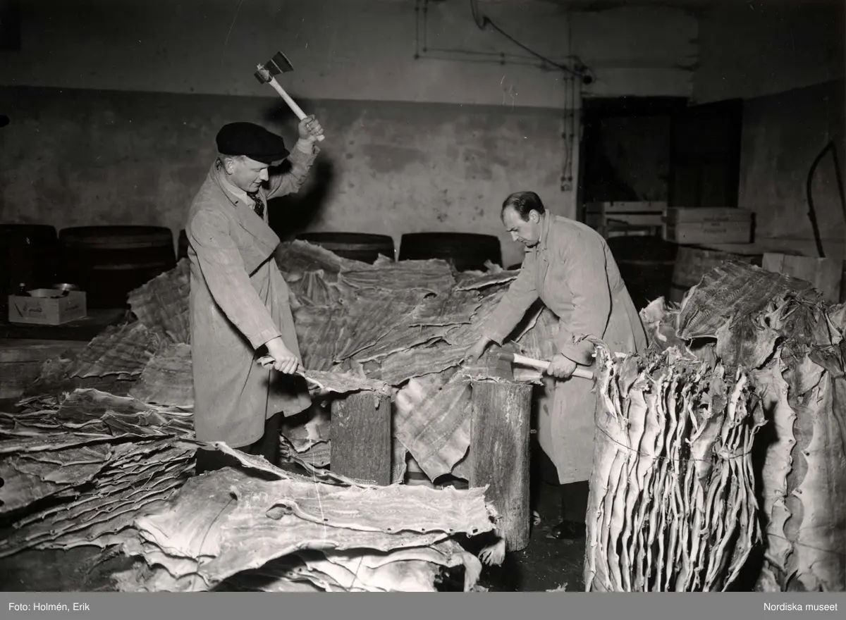 Titel: Lutfiskberedning, för varuhuset Nordiska Kompaniet i Stockholm. Två män iförda skyddsrockar bearbetar stycken av torkad fisk med yxor. Intill dem ligger mängder av fisk utspritt och i sammanbundna buntar.