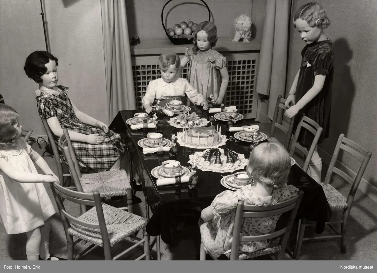 "Kost och Konst". Dockor kring ett dukat kaffebord med koppar, fat och bakverk. Varuhuset Nordiska Kompaniet i Stockholm 1936.
