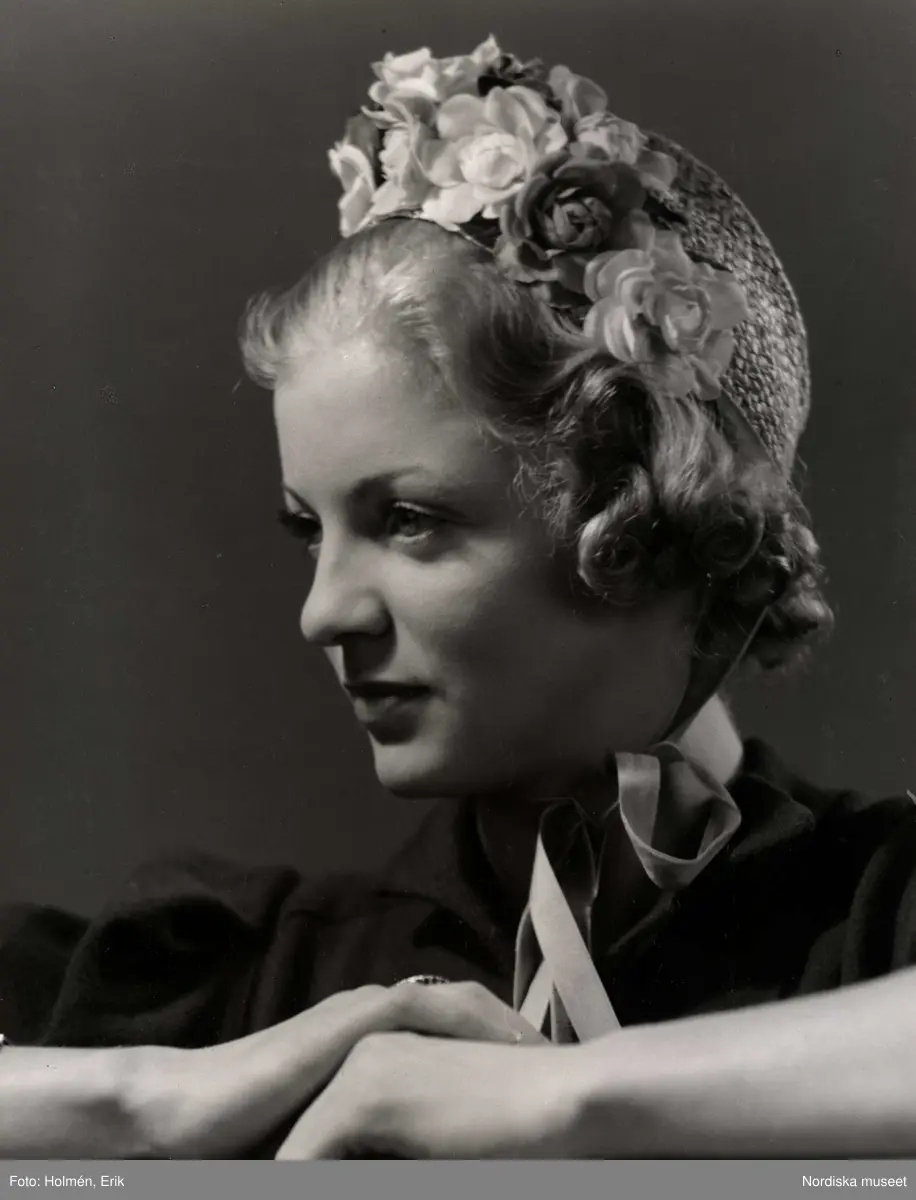 En ung kvinna poserar i halvprofil iförd en liten hatt med dekor av tygblommor. Hatten har ett knytband.