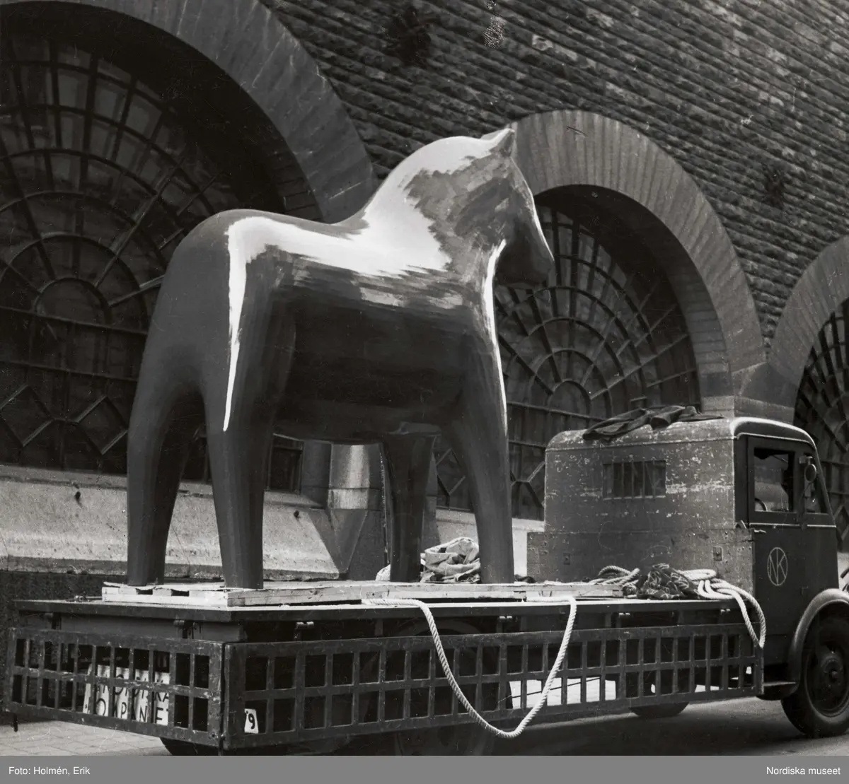 Stor dalahäst (tillverkad för världsutställningen i New York 1939) uppställd på lastbilsflak. Nordiska Kompaniet.