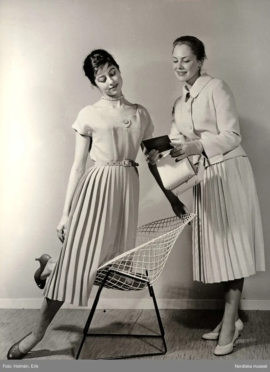 Tonårsmodet på Nordiska Kompaniet i Stockholm 1957. Kläderna från Fougstedt. Jacka och klänning kostade 179 kronor.