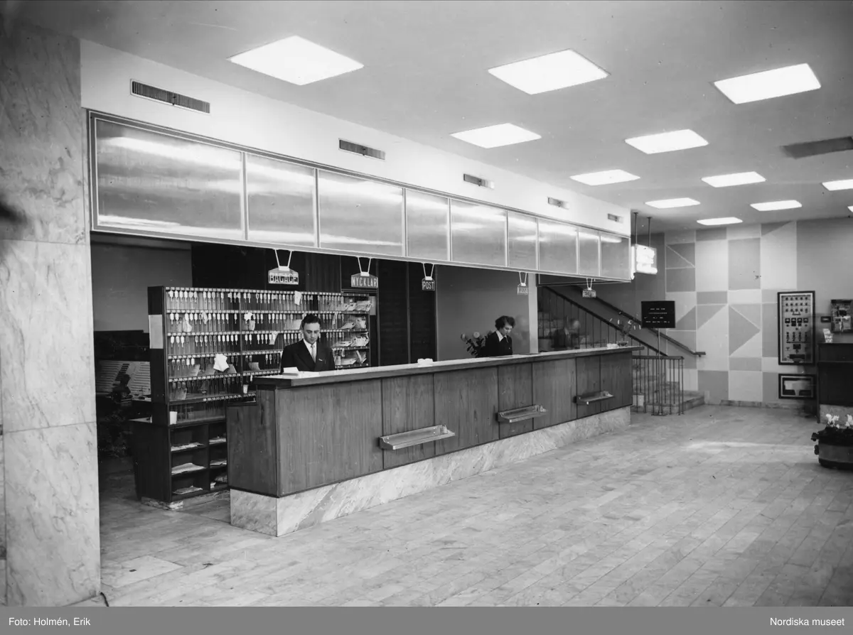 Interiör från Hotell Malmen i Stockholm. Bilden visar lobbyn där portieren arbetar bakom disken. Foajén är stramt inredd i femtiotalsstil med rena linjer och grafiska mönster. Inredning från varuhuset Nordiska Kompaniet.