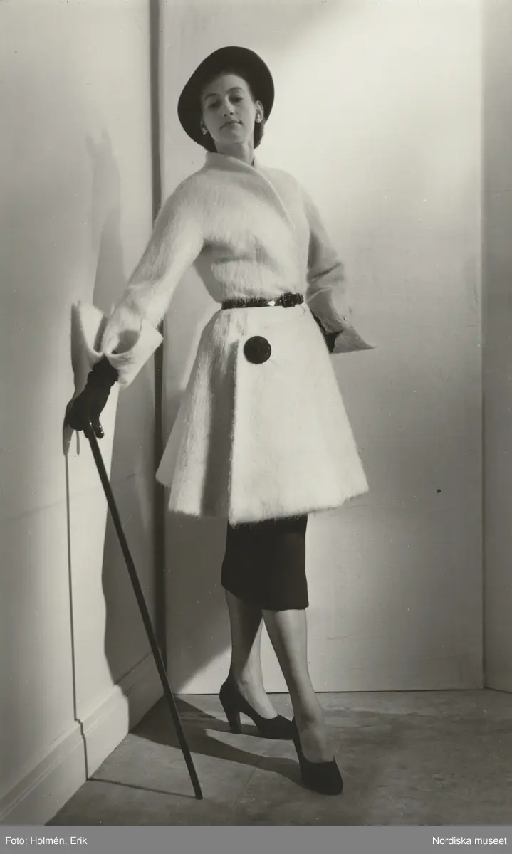Modell i vit pälskappa med svart skärp och stor, svart knapp, svarta handskar, hatt och käpp. Från J. Fath.