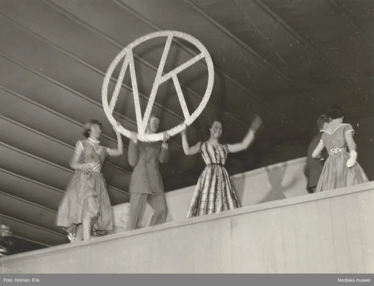 Tonårsmode visas i Kungsträdgården i Stockholm, Nordiska Kompaniet. Två kvinnor i klänningar och en man i kostym håller upp NK-loggan.
