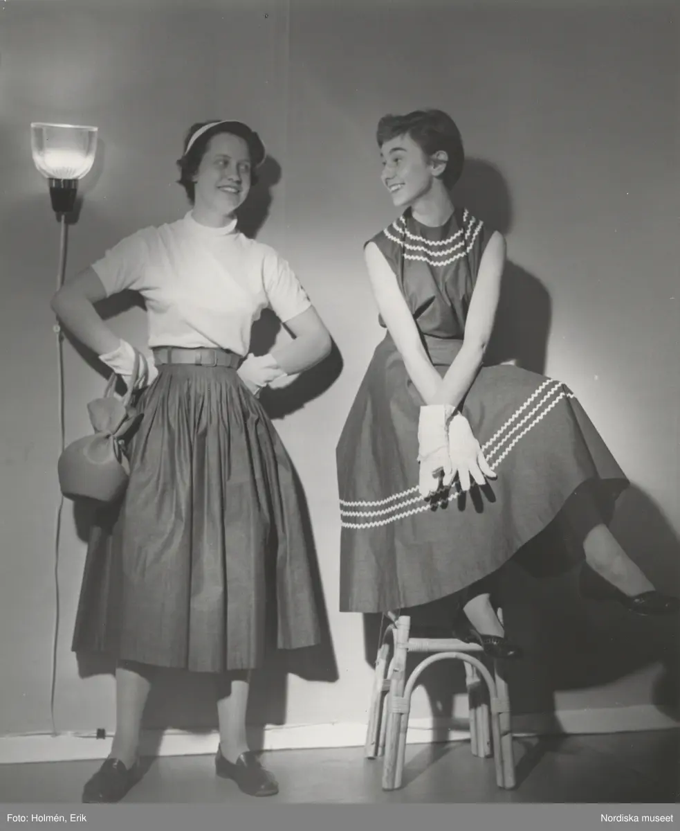 Modell till vänster i vit, kortärmad polotröja, vid kjol, skärp, handskar och påsväska. Modell till vänster i klänning med vita applikationer och handskar, på en pall. Lampa på väggen.