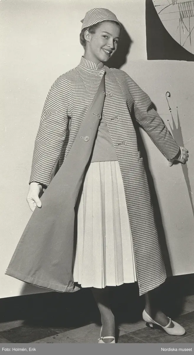 Modell i vändbar randig kappa i poplin och hatt, vit, veckad kjol och handskar. Mästersöm 145:-