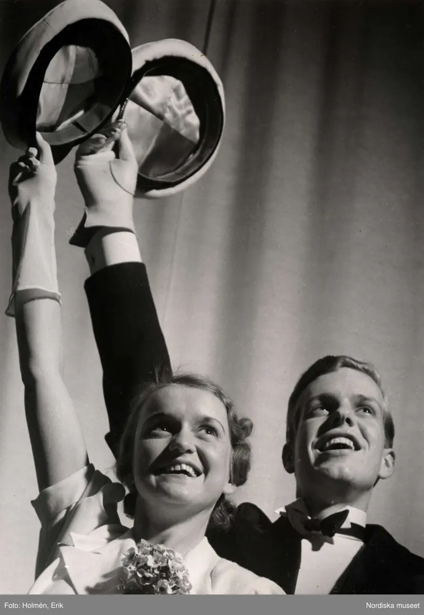 Skolan är slut. En ung kvinna och en man som leende sträcker upp sina studentmössor i luften. Varuhuset Nordiska Kompaniet i Stockholm 1936.