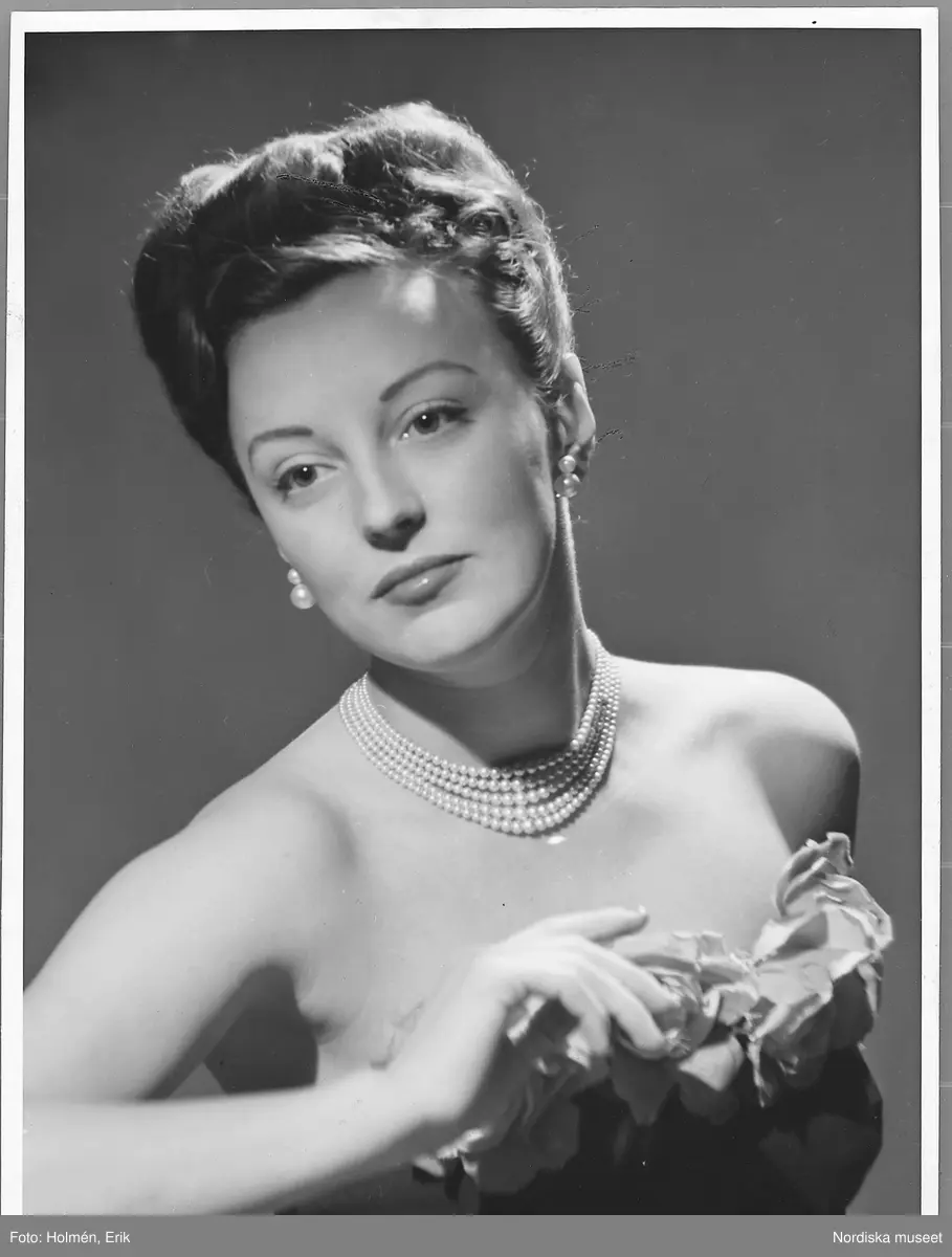 Kvinna med halssmycke. Porträtt av kvinna klädd i baraxlad aftonklänning och med uppsatt hår. Runt halsen bär hon ett kort femradigt pärlhalsband och i öronen örhängen med pärlor.