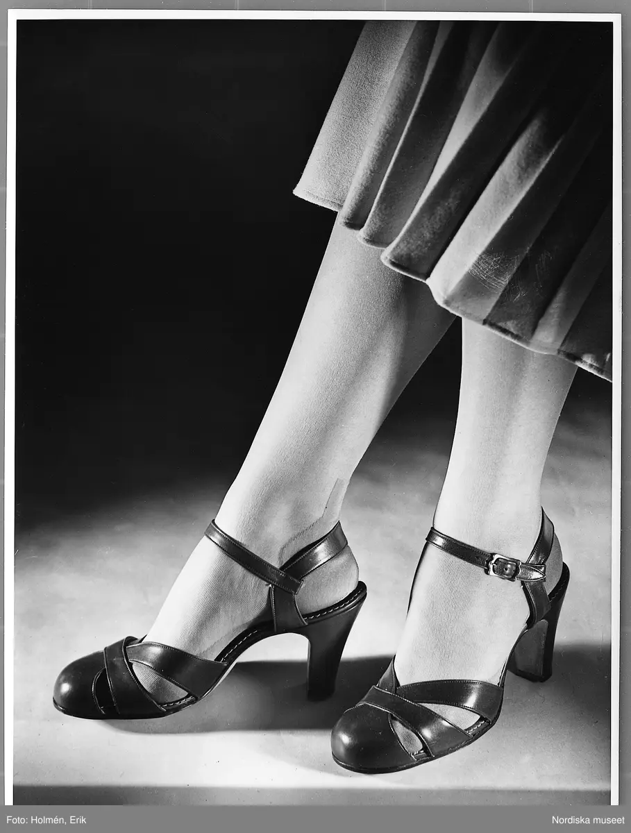 Skomodet 1948 visas av kvinnlig modell. I bild endast kvinnans fötter och ben, hon bär ett par sandaletter med vristrem, flätad tåkappa och halvhög klack. Hon har tunna strumpor med fotförstärkning och en plisserad kjol..