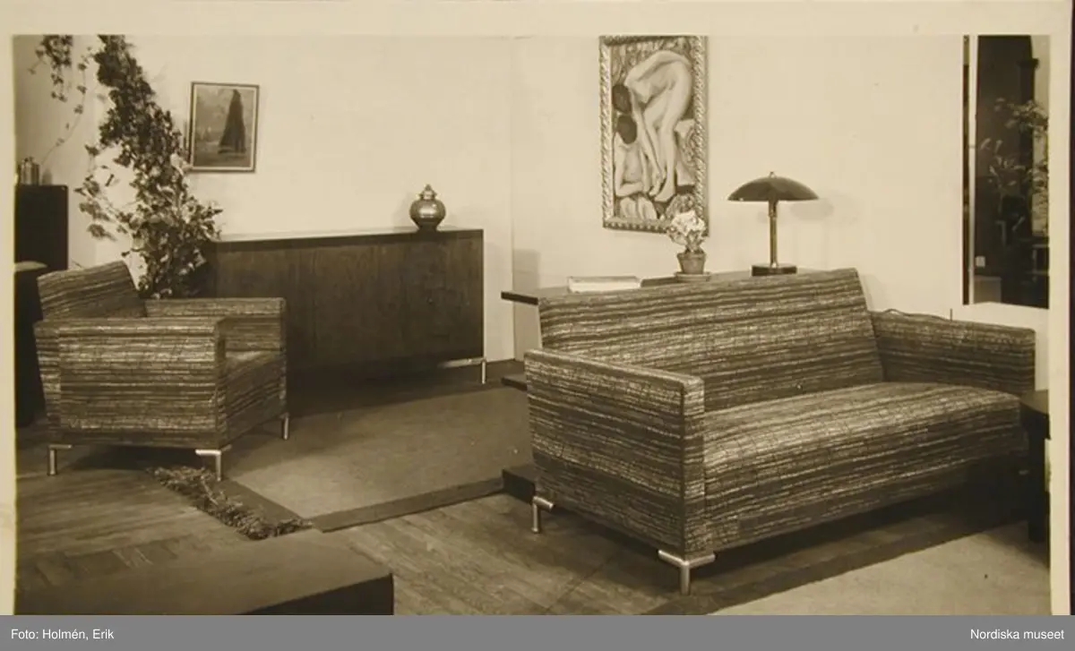 Möbelutställning på Nordiska Kompaniet, "Arkitekt Hjorts utställning våren 1933". Soffa och fåtölj modell "Record" formgivet av Axel Einar Hjort.