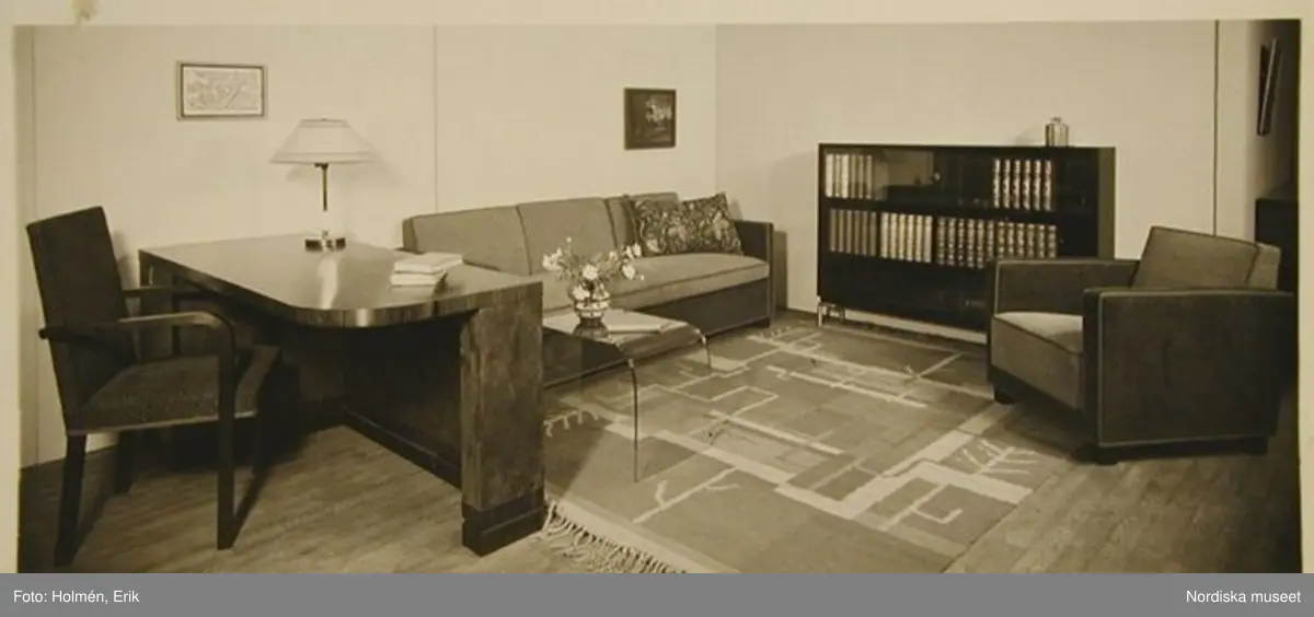 Möbelutställning på Nordiska Kompaniet, "Arkitekt Hjorts utställning våren 1933". Möblemang modell "Record" formgivet av Axel Einar Hjort. Skrivbord, stol, soffa, fåtölj, bord och bokhylla.