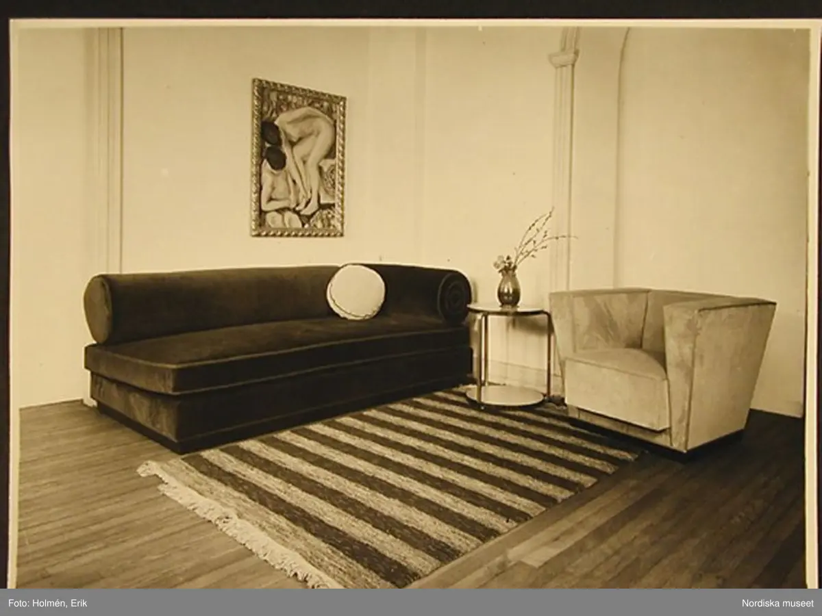 Möbelutställning på Nordiska Kompaniet, 1932. Soffa och fåtölj modell "Lido" formgivet av Axel Einar Hjort.