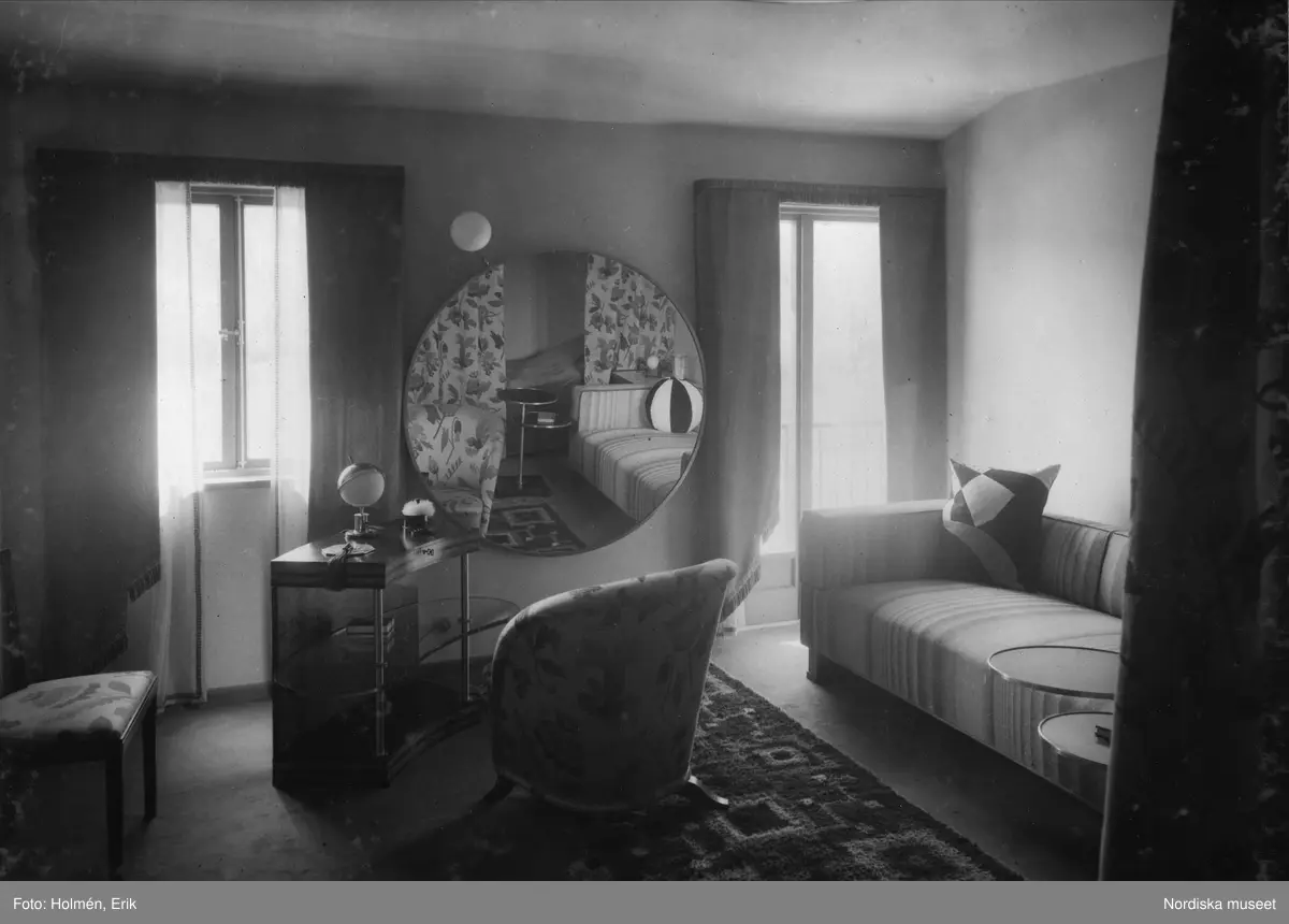 Nordiska kompaniet, Stockholmsutställningen 1930. Sovrum. Möblerna gjorda av svart och gråpolerad björk med karmar och handtag av förnicklad mässing. Arkitekt Axel Einar Hjorth.