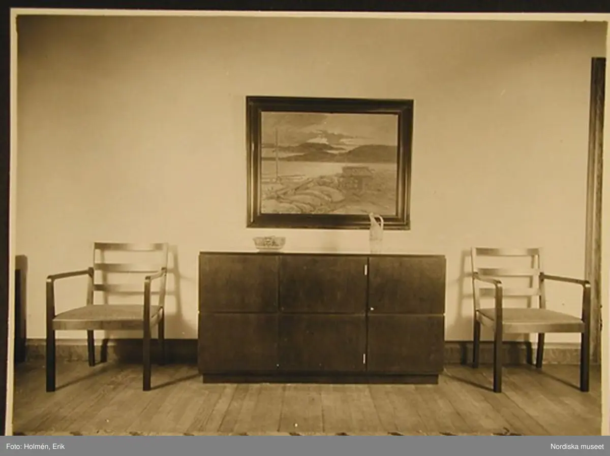 Möbelutställning på Nordiska Kompaniet, Arkitekt Hjorts utställning 1932". Skåp och två stolar av modellen "Typenco" formgivna av Axel Einar Hjort.