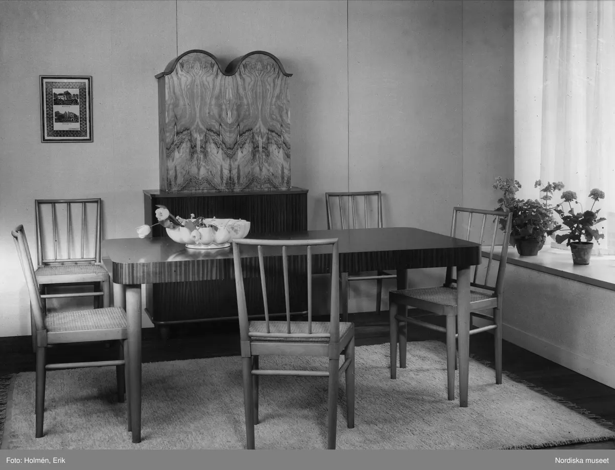 Vardagsrumsinteriör, möbelutställning "Vackar möbler" på Nordiska kompaniet. Möbler formgivna av Axel Einar Hjorth.